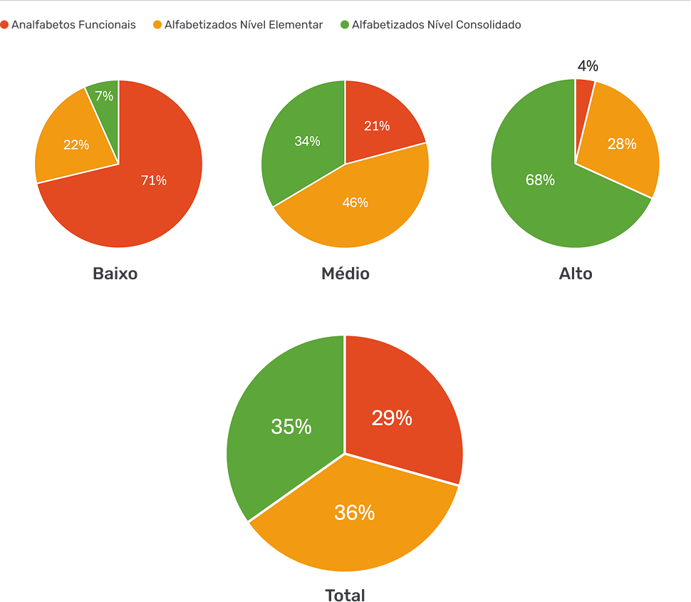 (analfabetos funcionais = nível analfabeto + nível rudimentar // nível consolidado = nível Intermediário + nível Proficiente)